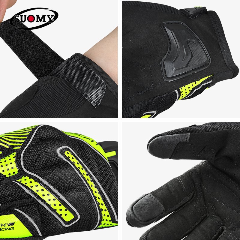 “Crafted from high-quality TPU, the SUOMY SU-12 motorcycle gloves offer robust protection without sacrificing flexibility and comfort. TPU material is renowned for its resistance to oil, grease, and abrasion, making these gloves an ideal choice for rigorous motorcycle racing. The full-finger style provides comprehensive protection, safeguarding every part of the hand from potential impacts and abrasions, while the touch screen functionality ensures riders can use devices without removing their gloves.”